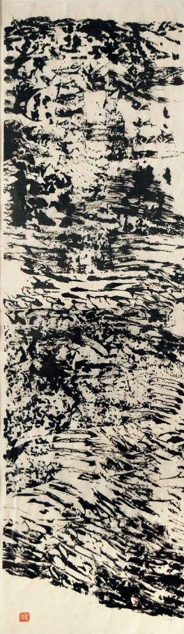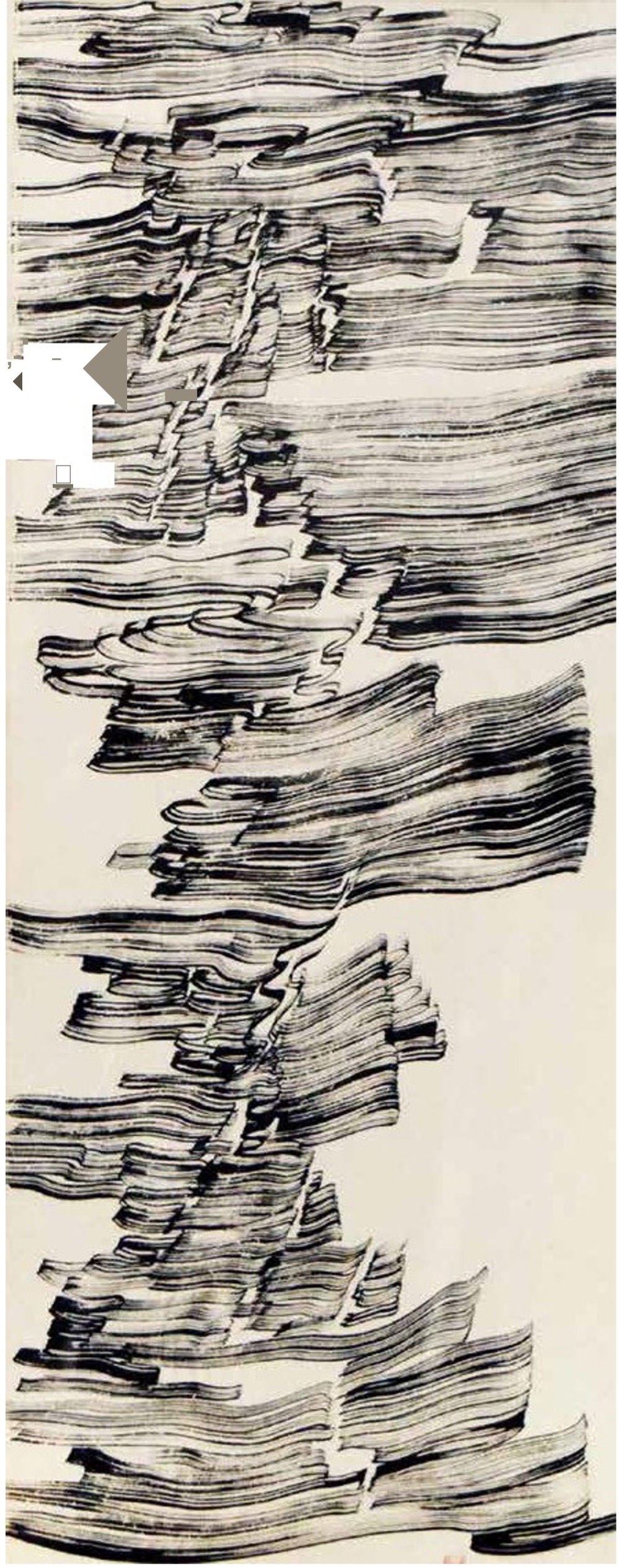 Two notable works embody her interest in developing ink landscapes into linear abstraction and material surface.